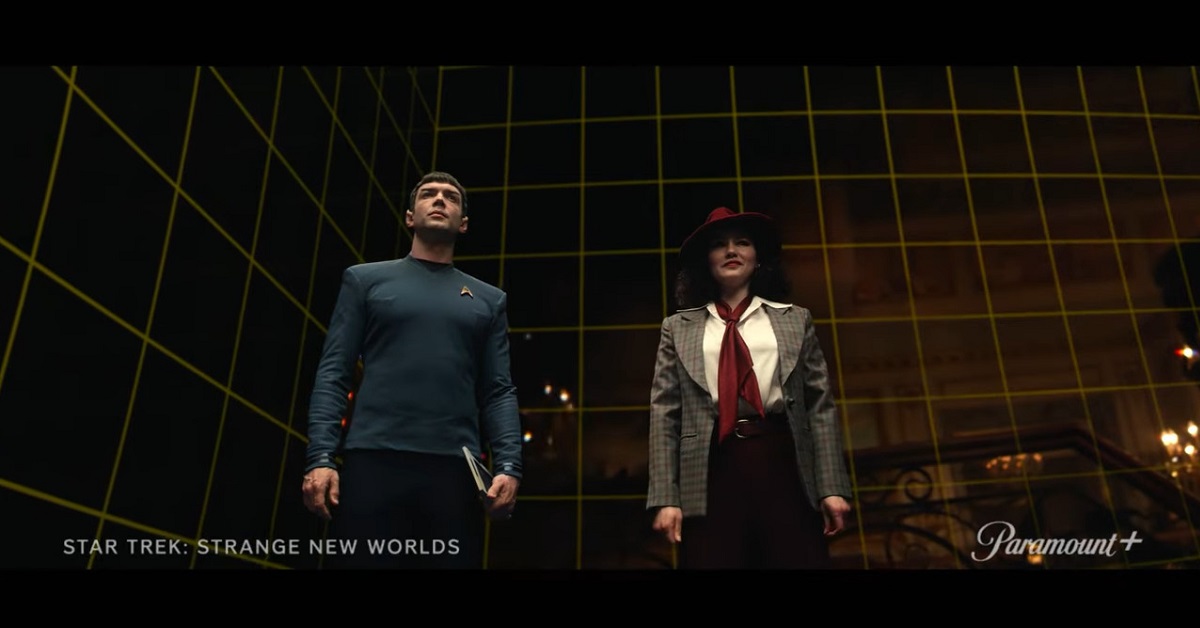 The teaser promises 10 new adventures, romance, mystery, and “a touch of analog.” It begins with James Kirk (Paul Wesley) and others sporting a very retro look. Then Captain Christopher Pike (Anson Mount) kicks things into action and we see Spock (Ethan Peck) and Christina Chong (La’an Noonien-Singh) in what appears to be a holodeck.