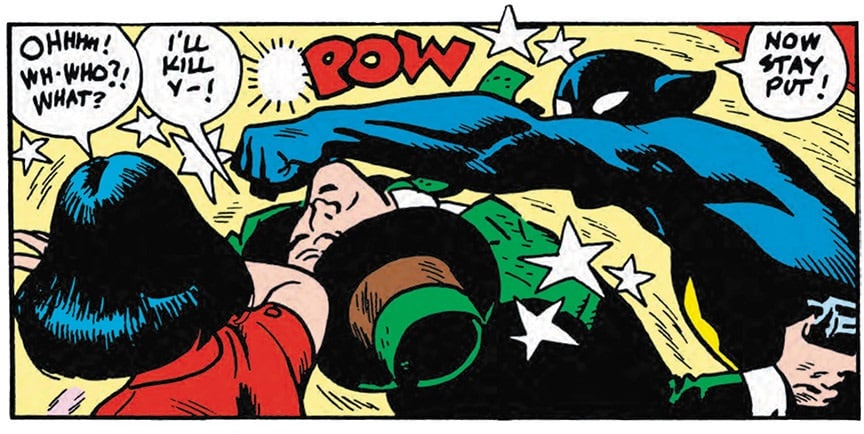 While overall Toth’s art is less exaggerated this outing, he adds an extra special touch not present in the previous tale: the Fox’s totally white eye slits in his mask (nee The Phantom or Batman) are altered as needed to convey expressive reactions. The effect is more akin to the white eyes on Spider-Man’s mask leaving the reader to wonder whether they are really “slits” at all. An effective choice that heightens the entertainment value of the story.
