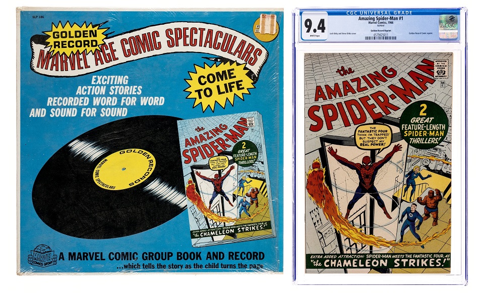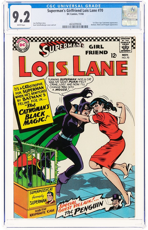 The comic auction features The Amazing Spider-Man #1 Golden Record set CGC 9.4 with the dramatized recording of the issue on vinyl. Superman’s Girlfriend Lois Lane #70 CGC 9.2 showcases Catwoman’s first Silver Age appearance after she disappeared due to the Comics Code Authority.
