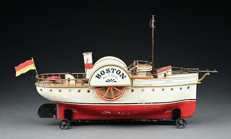 Sage loved his Marklin boats and owned many extremely fine productions. Several carried the prestige of appearing in the 1995 book Pressland’s Great Book of Tin Toys, a now-classic reference written by London-based toy expert David Pressland. One such boat was a circa 1902-1904 Marklin clockwork paddle wheel boat Boston, which presented in excellent condition with a few minor exceptions: a replaced mast, incorrect flag and a few burn spots to the hull that were incurred at some point when the clockwork mechanism’s mounts were resoldered. The 19-inch tin vessel sold at Morphy’s for $79,950 against an estimate of $30,000-$40,000.