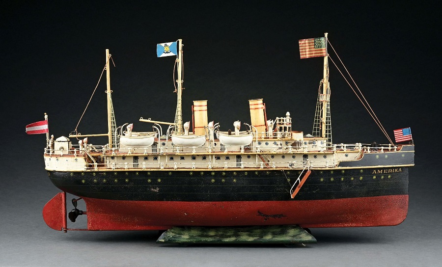 A sizable 29-inch Marklin clockwork ocean liner Amerika, Catalog Ref 5050, was a first series production that came with its original stand, mast, and lifeboats. In excellent condition and accompanied by its original wooden box, it sailed to $60,000 against an estimate of $30,000-$50,000. Other notable Marklin clockwork boats included a Ref 5044 Milwaukee, $52,800 (est. $30,000-$40,000); a Ref 5103 Columbia gun boat, $48,000 (est. $15,000-$25,000); and a circa 1904-1908 Ref 1089 H.M.S. Edward VII cruiser ship which sold above its high estimate for $21,600.