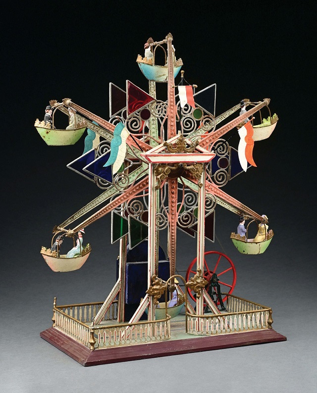 As predicted, the day’s top lot was the auction catalog’s cover piece, a magnificent 1904 Ferris Wheel made by the revered German firm Marklin. One of only three or four of its type known to exist, it was likely the nicest of that handful of survivors, retaining its six original gondolas, attractive stained glass, and original figures. It had passed down through the family of a gentleman who had worked for a Brooklyn department store and received the toy when the business closed down sometime before World War I. Sage purchased the Ferris Wheel at Sotheby’s in 1994 and, according to his son, toy authority Tommy Sage Jr., he thought so highly of it, he displayed it in his bedroom. Its unusually complete provenance conveyed with the toy in the form of paperwork, copies of circa 1910 photos of its then-owner (a relative of the original owner) holding the Ferris Wheel; and Sage’s 1994 Sotheby’s tag and receipt. It ended its bidding run at a buoyant $156,000.
