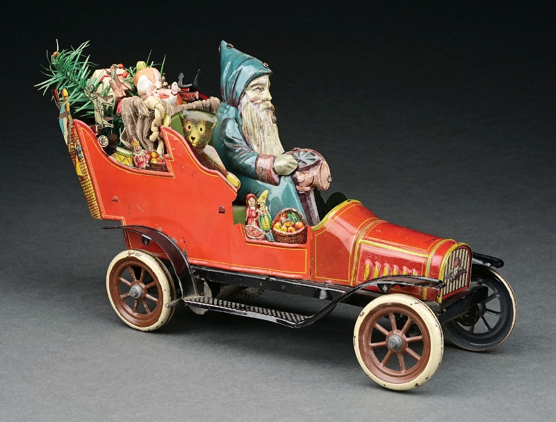 Sage’s enviable fleet of automotive toys was led by a circa 1912 Fischer Father Christmas car with a green-coated Santa figure at the wheel. Its colorful design incorporated a lithographed tin cargo of toys, teddy bears, fruit, candy, and other treats the holiday gift-giver might leave in children’s Christmas stockings. In mint condition and surely one of the finest of few surviving examples of its type, it raced to $84,000 against an estimate of $15,000-$25,000.