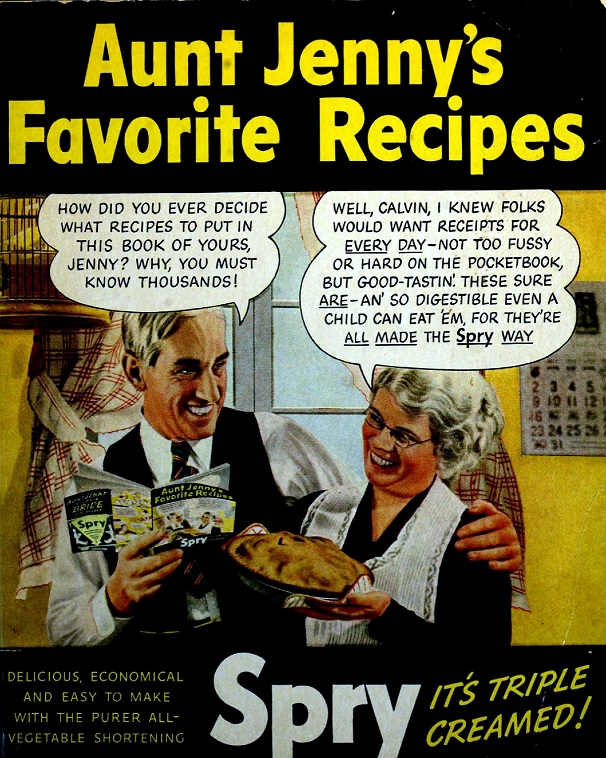 At the beginning of each Aunt Jenny episode, she and her program announcer, Dan Seymour, caught listeners up on the goings on between residents in the town of “Littleton.” But before segueing into the melodramatic acting sequences, she also gave her audience “recipes of the day,” all of which contained Spry shortening as a key ingredient.
