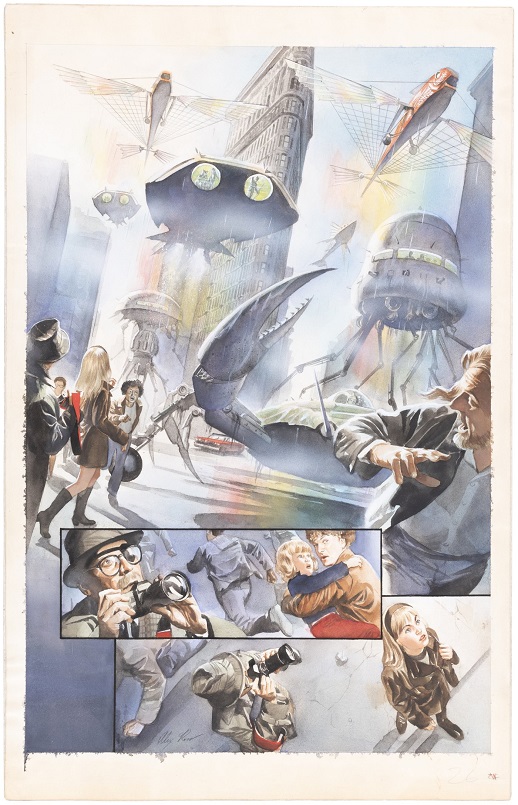 The Marvels #4 comic page by Alex Ross surpassed its $10,000 estimate when it sold for $16,874. The gouache and wash art comes from page 26 of the limited series. Ross’ realistic style is featured on a three-panel page dominated by Sub-Mariner’s Atlantean landing force advancing on New York City.