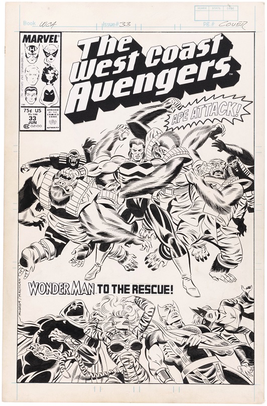 The West Coast Avengers #33 cover by Al Milgrom with inks by Mike Machlan hammered for $9,735. It shows Wonder Man battling a troop of advanced ape warriors with Moon Knight, Tigra, Hawkeye, and Mockingbird defeated in the foreground.