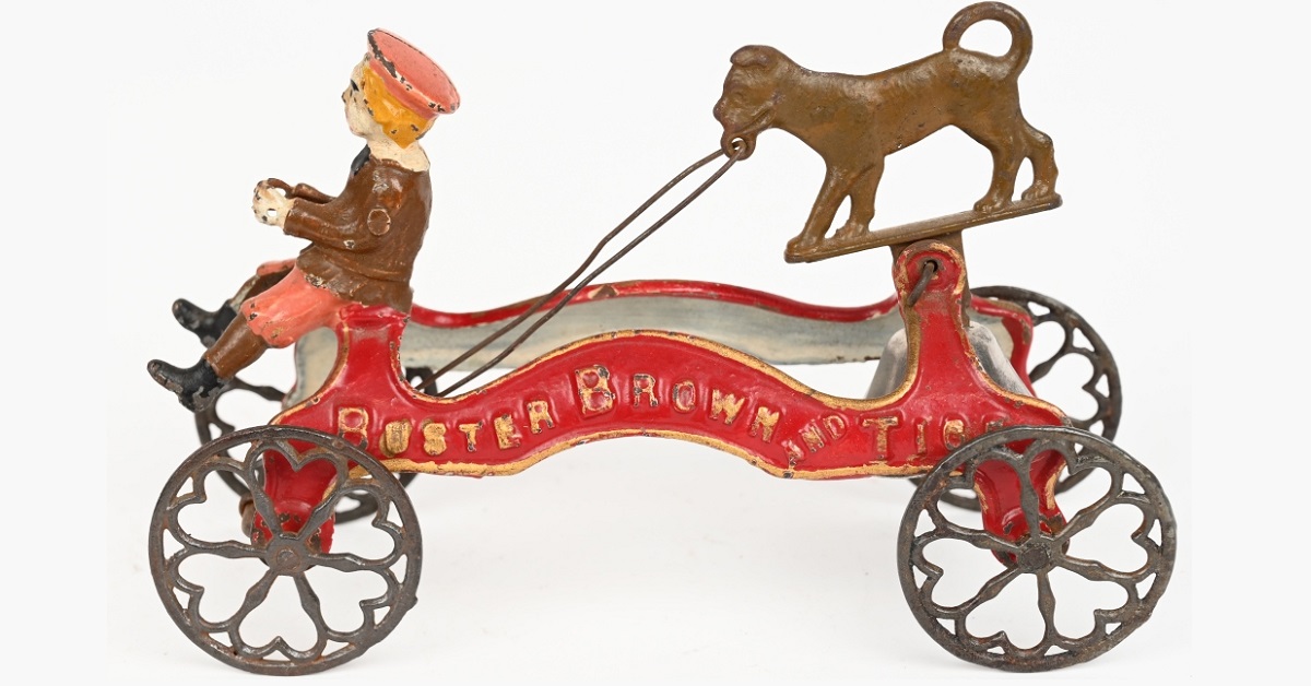 Bell toys, rare banks, and rare Victorian Christmas cards rose to the top at Milestone’s December 6 Winter Premier Antique Toy & Bank Auction...