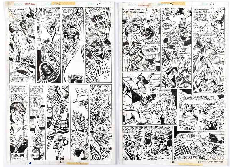 In the original art auction, Heritage has Felipe Massafear’s Lobo illustration that captures the Last Czarnian’s brute strength and bad attitude. Al Milgrom’s Captain Marvel #41 story pages 15-16 presents the sequence when the Kree Supreme Intelligence separates Mar-Vell and Rick Jones, leaving each with one Nega-Band.