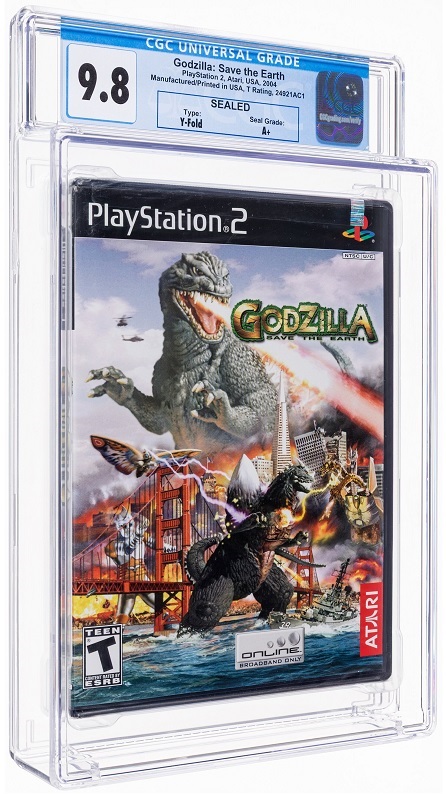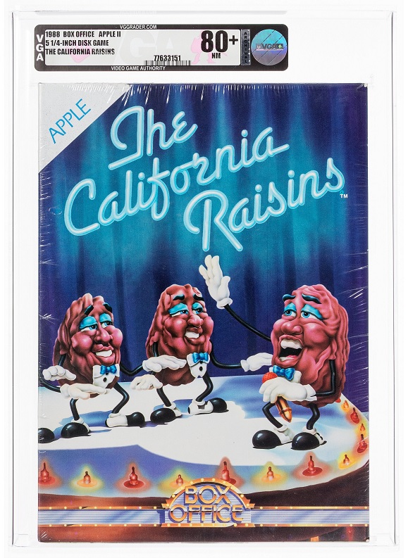 The video game auction is led by Godzilla: Save the Earth CGC 9.8 sealed for PlayStation 2 is the sequel to Godzilla: Destroy All Monsters Melee, featuring a challenge mode, online play, and underwater stages. The California Raisins VGA 80 sealed for Apple II Box Office stars the stop-motion band in a classic arcade style platform.