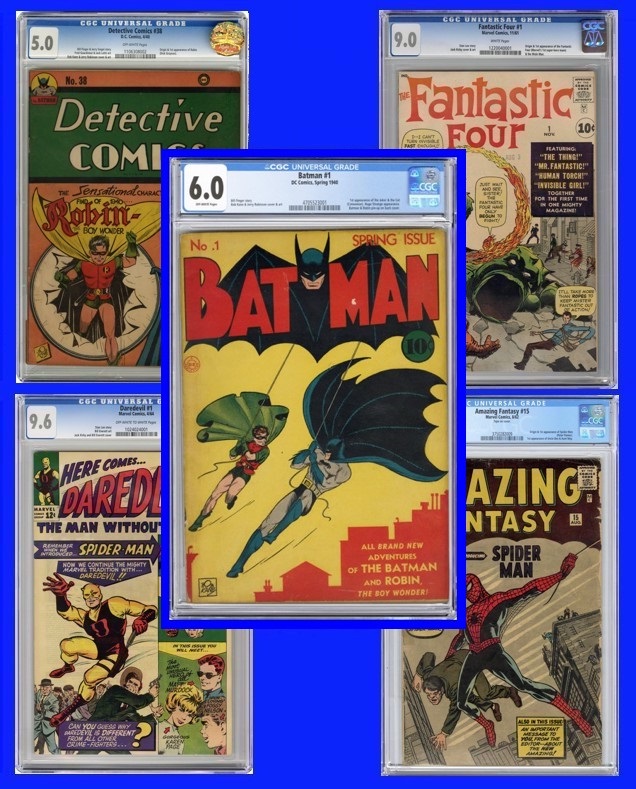 Neal Adams ushers in DC’s Bronze Age with Man-Bat in Detective Comics #400 9.8, plus Bronze Age keys from Marvel like Incredible Hulk #181, Giant-Size X-Men #1 9.6, and Ghost Rider #1 9.8. The Modern Age is led by 1990’s Spider-Man #1 CGC Signature Series Todd McFarlane.
