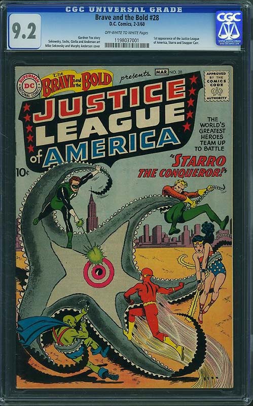 “Along with Showcase #4, Brave and the Bold #28 is one of the most important Silver Age DC comic books ever published. For the first time in the Silver Age, popular heroes were brought together and united on one team,” Nathanson said. “The Justice League of America were featured within issues 28-30 and then transferred over to a title bearing the team’s name with issue 1. The JLA have been an important part of the comic book world ever since! This is one of the top six graded overall for Brave and the Bold #28. There are only three other examples at the 9.2 tier, with just a single 9.4 and a single 9.6 above it. This example has retained supple Off-White to White Pages.”