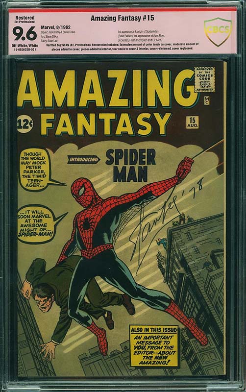 • Amazing Fantasy #15 – multiple examples including CBCS 9.6R signed by Stan Lee, CGC 3.0, and CBCS 3.0 signed by Stan Lee