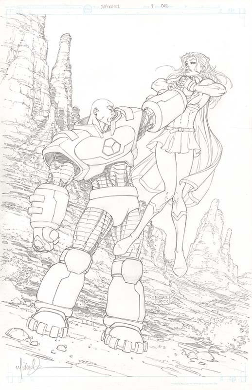 Original art highlights are the Todd McFarlane Spider-Man #9 cover with Wolverine; Jim Lee Punisher War Journal #3 cover; John Byrne and Terry Austin X-Men #135 page, #143 page, and finale page; Johnny Craig Vault of Horror #34 complete eight-page story; Ed Hannigan and John Romita Man-Thing #20 cover with Spider-Man and other heroes; Jack Kirby Thor #148 page; Erik Larsen Amazing Spider-Man #350 page with Doom; Frank Miller 300 promotional illustration that pre-dates the series; George Pérez Crisis on Infinite Earths #10 page; Jim Starlin Strange Tales #181 Adam Warlock page and Warlock #15 Adam Warlock, Thanos, and Gamora page; Herb Trimpe and John Severin Incredible Hulk #141 significant Doc Samson page from his first appearance; and Michael Turner Supergirl #3 variant cover with Lex Luthor.