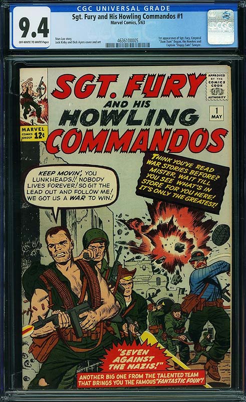 Top Silver Age offerings include Showcase #4 (first Silver Age Flash) CGC 9.0, Brave and the Bold #28 (first Justice League) CGC 9.2, Sgt. Fury and His Howling Commandos #1 (first Nick Fury) CGC 9.4, Amazing Fantasy #15 CGC 5.0, Amazing Spider-Man #1 CGC 4.5, #6 CGC 9.6, #9 CGC 9.6, #12 CGC 9.6, #30 CGC 9.8, #31 CGC 9.8, #38 CGC 9.8, #42 CGC 9.8, and Annual #1 CGC 9.4, Avengers #1 CGC 8.0, Batman #181 CGC 9.4, Daredevil #1 CGC 8.0 and #9 CGC 9.8, Fantastic Four #1 CGC 6.5, #5 CGC 9.2, #26 CGC 9.8 (highest, one of four), #33 CGC 9.8, #46 CGC 9.8 White Mountain Pedigree, #48 CGC 9.6 CVA, and #49 CGC 9.4, Incredible Hulk #1 CGC 7.0 and CGC 6.0, and Annual #1 CGC 9.8, Iron Man #1 CGC 9.6, Journey Into Mystery #83 CGC 7.0, #85 CGC 9.2 White Mountain Pedigree, and #103 CGC 9.8 (highest, one of two), Showcase #23 CGC 9.4 (highest, one of two), Silver Surfer #10 CGC 9.8, Star Trek #1 CGC 9.6, Sub-Mariner #1 CGC 9.8, Tales of Suspense #39 CGC 8.0 and CGC 6.5, #52 CGC 9.6 (highest, one of four), and #58 CGC 9.6, Thor #156 CGC 10.0 (only 1960s comic book in CGC 10.0), and X-Men #1 CGC 7.0 and CGC 5.0 and #44 CGC 9.8 (highest, one of three).