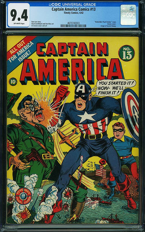 Golden Age comic book highlights include Captain America Comics #13 CGC 9.4, #16 CGC 9.0, and #46 CGC 8.0, More Fun Comics #73 (first Aquaman, Green Arrow, and Speedy) CGC 6.0, Action Comics #10 (third Superman cover) CGC 6.5R and #13 (fourth Superman cover) CGC 5.5, Marvel Mystery Comics #9 CGC 5.5, #10 CGC 9.0, and #37 CGC 9.4, Detective Comics #29 (second Batman cover, third Batman appearance) CGC 5.5R and #168 (Joker origin, first Red Hood) CGC 7.0, Flash Comics #1 CGC 2.0 Conserved, Wonder Woman #1 CGC 6.0, Chamber of Chills #19 CGC 8.5, All Select Comics #4 CGC 9.6, All Winners Comics #14 CGC 9.6, All Star Comics #8 (first Wonder Woman) CGC 3.0R, Green Lantern #1 CGC 7.0, Startling Comics #49 (Schomburg robot cover) CGC 6.5, Sub-Mariner Comics #15 CGC 9.2, Weird Fantasy #4 CGC 9.8, Silver Streak Comics #16 CGC 6.5, Batman #11 CGC 6.5 and #20 CGC 9.0 Spokane Pedigree, Blue Beetle #54 CGC 7.0, Mystic Comics Vol. 1 #3 CGC 8.0, and USA Comics #17 CGC 9.4.