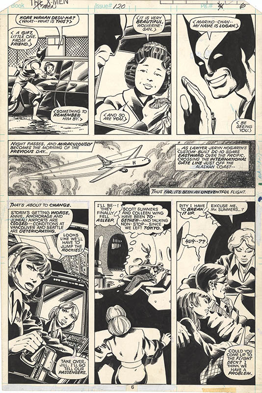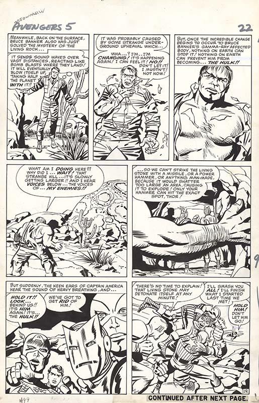 Featured art continues with Nick Cardy Legion of Super-Heroes #1 cover from the first self-titled Legion comic and Superman #258 cover; Jim Starlin Captain Marvel #27 and #30 pages, Strange Tales #181 Adam Warlock page all from the original “Thanos Saga,” and Iron Man #160 cover; Burne Hogarth Tarzan Sunday strip from 1950; John Buscema Silver Surfer #9 page with Mephisto and Avengers #58 page from the origin of the Vision; Barry Windsor-Smith Marvel Premiere #3 Doctor Strange page from the first Bronze Age Strange solo story and Conan the Barbarian #8 page; Alex Ross Doctor Strange #17 cover and Iron Man #9 cover; Sam Kieth Marvel Comics Presents #106 cover with Ghost Rider and Doctor Strange; Adam Hughes Catwoman #68 cover; Dave Cockrum X-Men #104 page with the New X-Men’s first exposure to Magneto’s power; Herb Trimpe Incredible Hulk #141 page 1 title splash heralding Doc Samson’s arrival and page 3 with his first actual appearance; and Bernie Wrightson The Monsters: Color the Creature Vampire illustration.