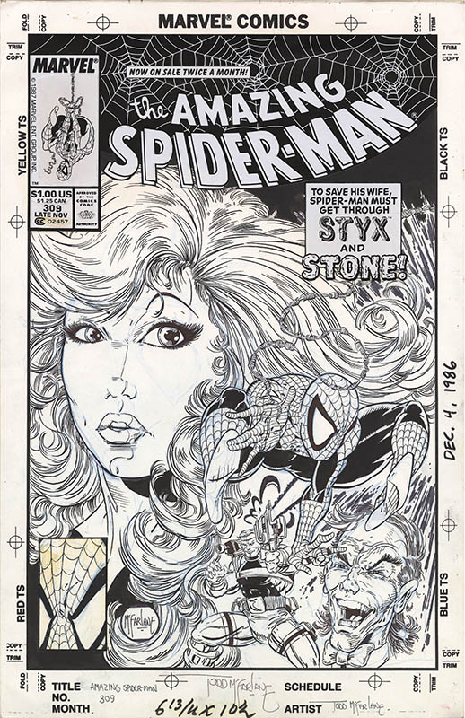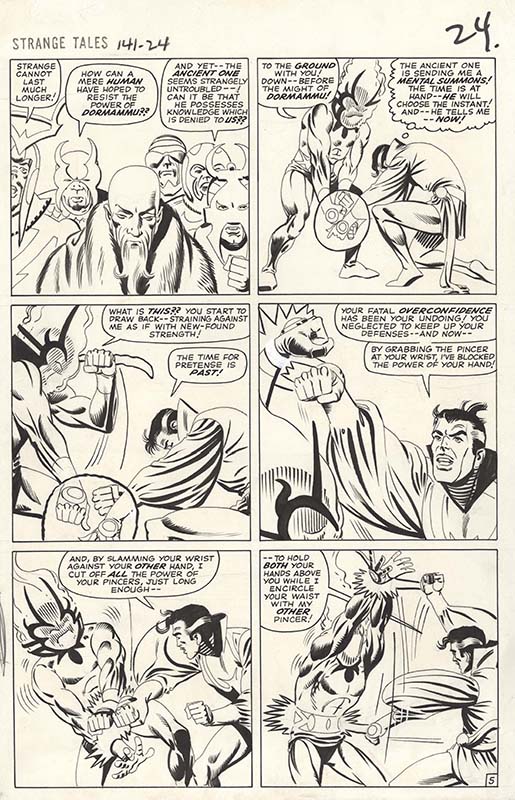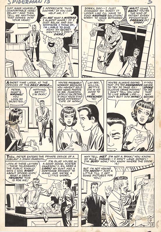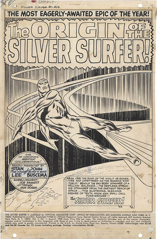 Top original art lots are John Buscema and Joe Sinnott Silver Surfer #1 page 1 title splash for “The Origin of Silver Surfer!”; Todd McFarlane Amazing Spider-Man #309 cover and Spider-Man #14 splash with black suit Spidey and Morbius; Steve Ditko Amazing Spider-Man #13 page with Spider-Man/Peter Parker in every panel and Strange Tales #141 Doctor Strange page with Strange vs. Dormammu in multiple panels; Jack Kirby Avengers #5 page with Avengers vs. Hulk and #6 page with Avengers vs. Masters of Evil, Fantastic Four #28 page with the team vs. the X-Men, #63 page, and #100 page, Captain America #100 (first issue) splash with Captain America and Black Panther, and Thor #126 (first issue) page Thor vs. Hercules; John Byrne X-Men #120 two pages from the first Alpha Flight issue and #137 page from the “Dark Phoenix” finale; Hal Foster Tarzan Sunday strip from 1936 with Tarzan becoming King of the Apes; and Frank Miller Elektra Lives Again graphic novel page 2 with Matt Murdock taking confession.
