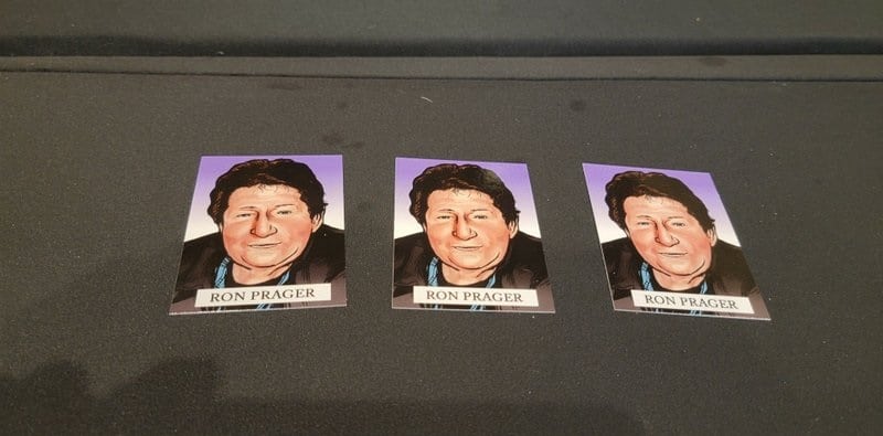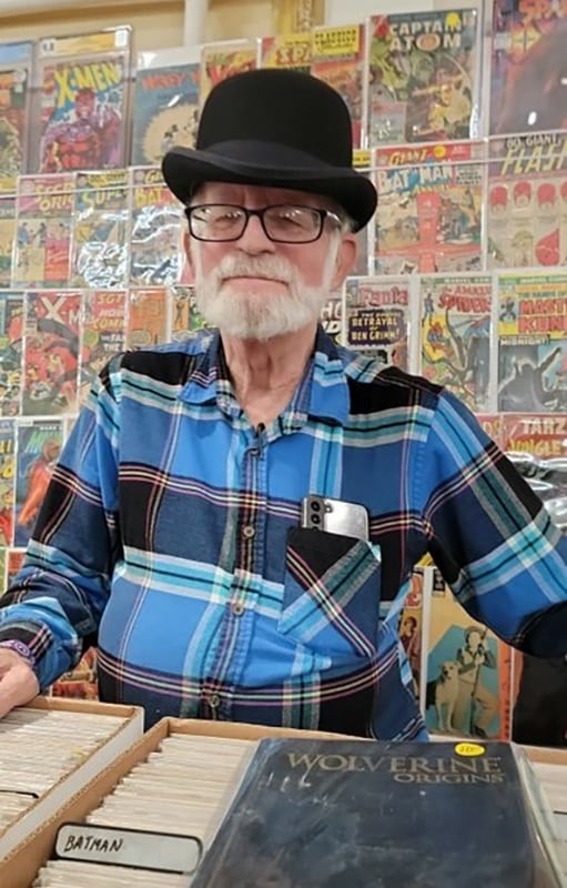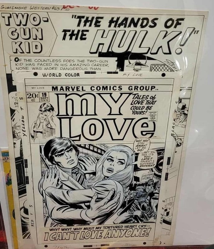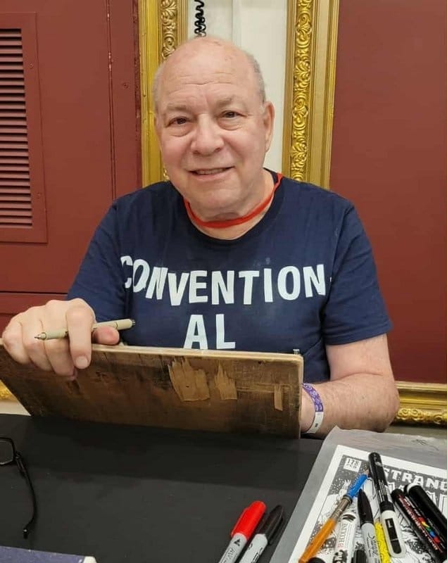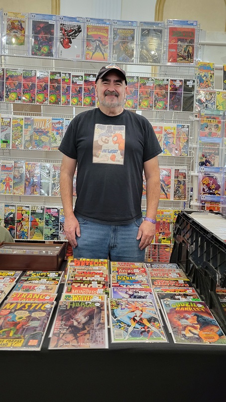 As I entered the show I came across a touching scene for Ron Pager, a former New York City high school history teacher (who taught at the same school I did before I worked there) and classic comics collector. After he retired he became a full time dealer and at Big Apple he always had his own table near the entrance to the main dealer’s room. He was a friend of ours and would always teased us (and me in particular) at various shows. He died in September 2025, and I was very sad to hear of his passing. As I came to what would have been his table at the show, I found it was empty except for memorial cards with his drawn image and name on them. A touching tribute from Mike Carbonaro and Big Apple.