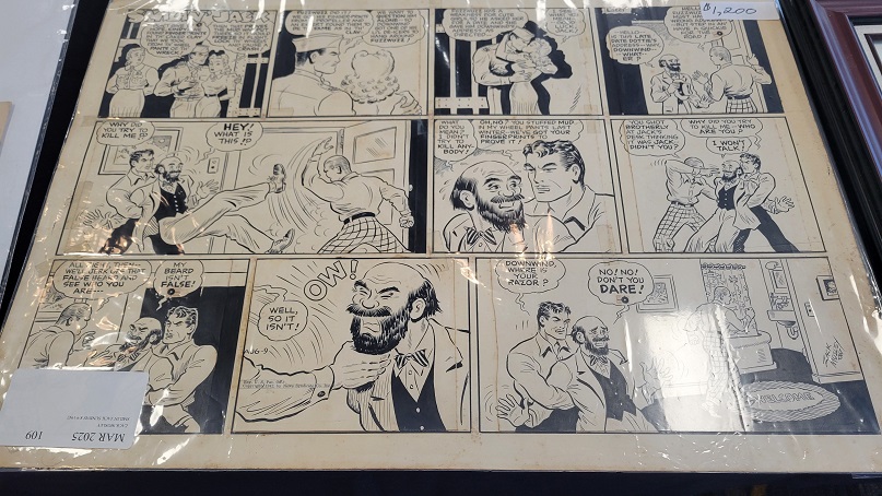 As to the rest of the show there was a strong showing of Silver, Bronze and Modern Age comic art, but there was less Golden Age art than at prior shows. Modern art from the 1990s is still hot and there were examples present. There was a variety of comic book covers for sale but that was only part of what was offered. Dealers had portfolios full of original comic book pages including splash pages. High-end special pieces were on display as were commissions, sketches, comic strip dailies, Sunday comic strips, and paintings. I have said in past reviews over the last few years that Marvel, both in vintage comic sales and original art, has tended to dominate what dealers offer at comic and comic art shows, but that is changing. At this one and the spring show, the ratio between Marvel and DC art continues to become more equal than in the past. Allie and I did not walk out of there with empty hands, and we were very happy with that.