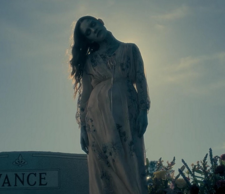 RK: Well, it’s the simplest of all of them. The Bent-Neck Lady was the one that stood out for everyone, and there was various, like, three different looks for her. Sometimes she had the mold growing on her, and she had the dead eyes, and sometimes that was just her with the bent neck and her beauty look. I guess the Tall Man or the Bowler Hat Man, because he was on wires and we had to extend his legs and he was floating and couldn’t walk. That was probably the most challenging overall, because he’s in a harness and we had to extend his arms and his legs.