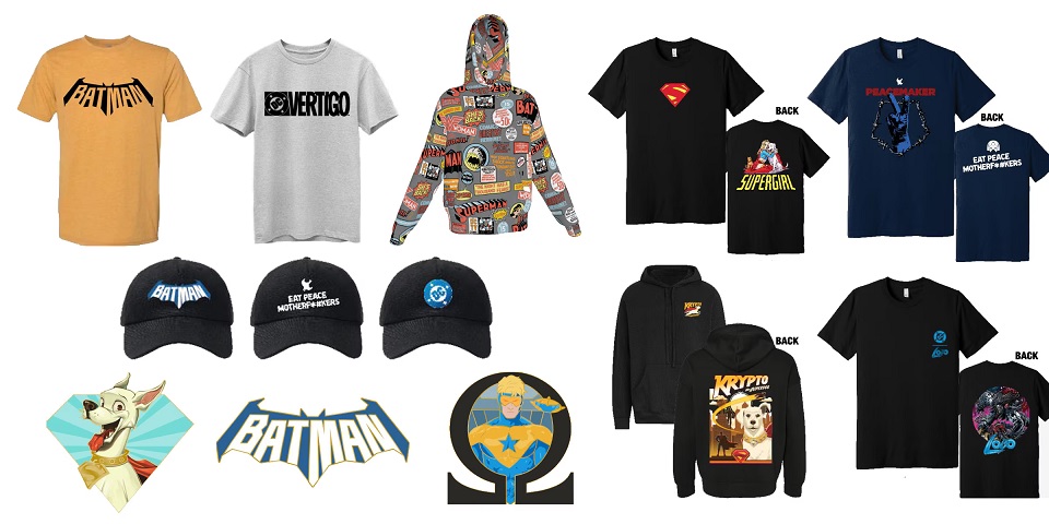 Additional merchandise includes a special “Legends Forever” hoodie featuring Superman, Batman, and Wonder Woman, a t-shirt, pin, and hat with the new Batman comic logo, a 24k gold-plated over 925 sterling silver S-Shield gold necklace, Krypto the Super-Dog hoodie, assorted pet goods based on Superman, a Supergirl t-shirt, and Peacemaker season two items.