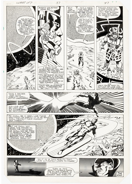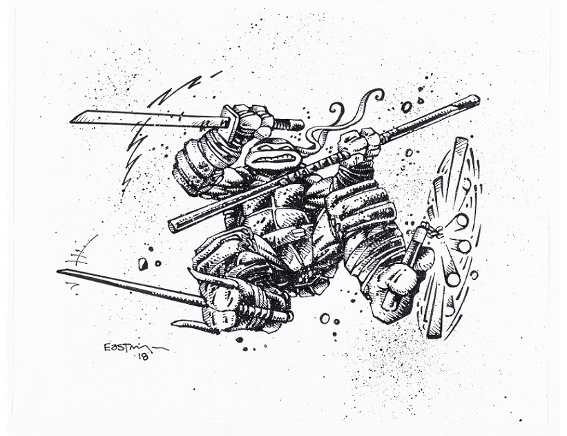 Heritage’s original art auction features Mike Vosburg and Steve Mitchell’s What If? #37 story page 12 that shows Galactus transforming Norrin Radd back into the Silver Surfer after he lost Shalla-Bal. Kevin Eastman’s Teenage Mutant Ninja Turtles illustration depicts one of the Turtles wielding the weapons of all four brothers.
