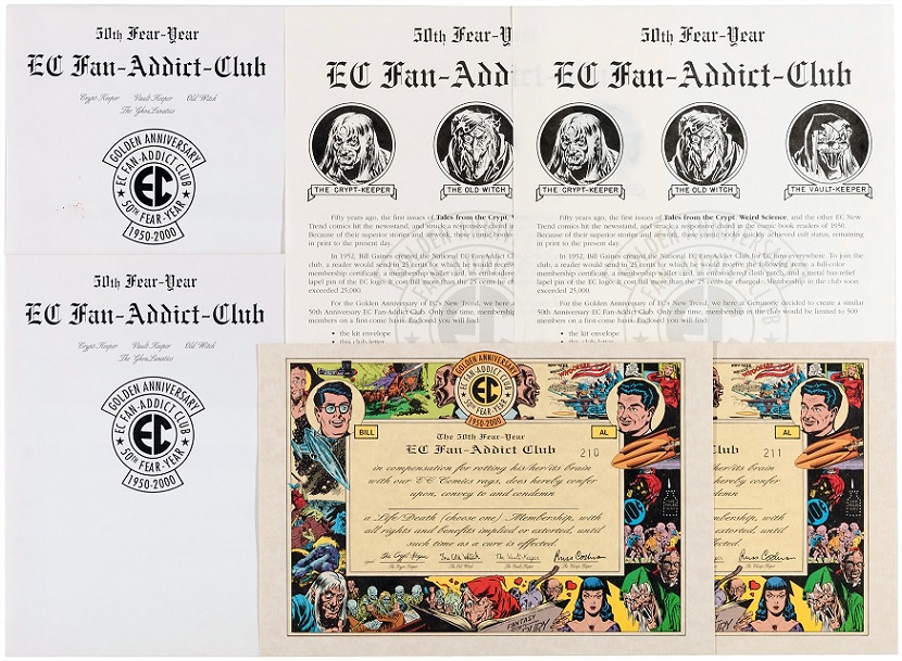 Shipped in a plain envelope marked with the EC logo, the club’s membership kit included a colorful membership certificate featuring a border comprised of images of EC characters The Crypt-Keeper, The Vault-Keeper, and The Old Witch (in recognition of EC’s popular horror comics Tales from the Crypt, Tales from the Vault, and The Haunt of Fear).