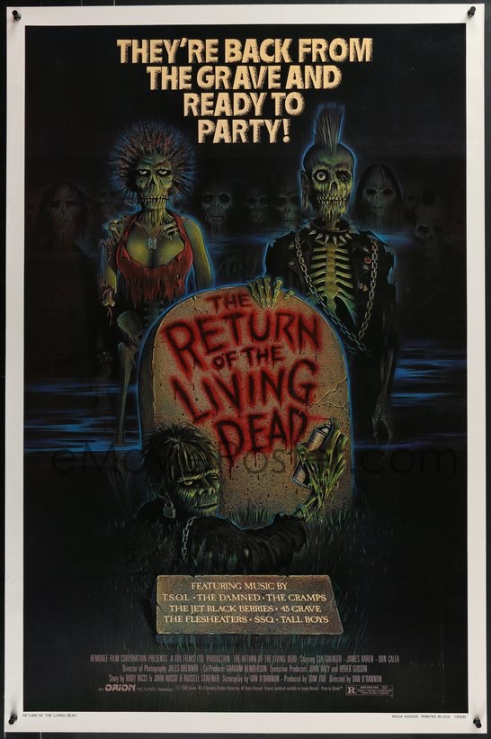 One-sheets are led by Return of the Jedi dated teaser and style B, Raiders of the Lost Ark, Return of the Living Dead, The Thing, Scarface, They Live double-sided, Robocop, Jurassic Park teaser, Ferris Bueller’s Day Off, and The Breakfast Club.
