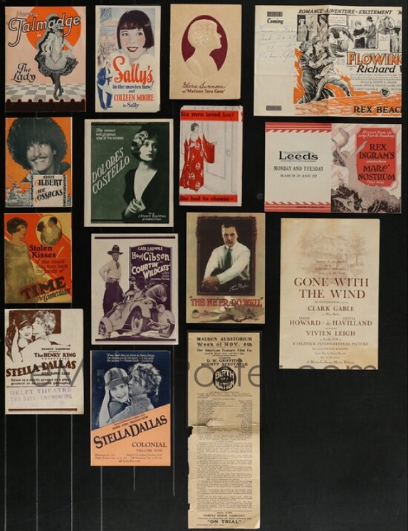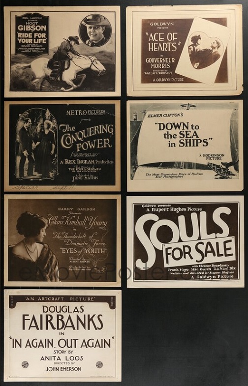 The silent film offerings include lots of 6-7 title cards, a lot of 10 Famous Players Lasky hand-colored lobby cards, lots of 10-16 Paramount color lobby cards, and a lot of 11 Realart lobby cards.