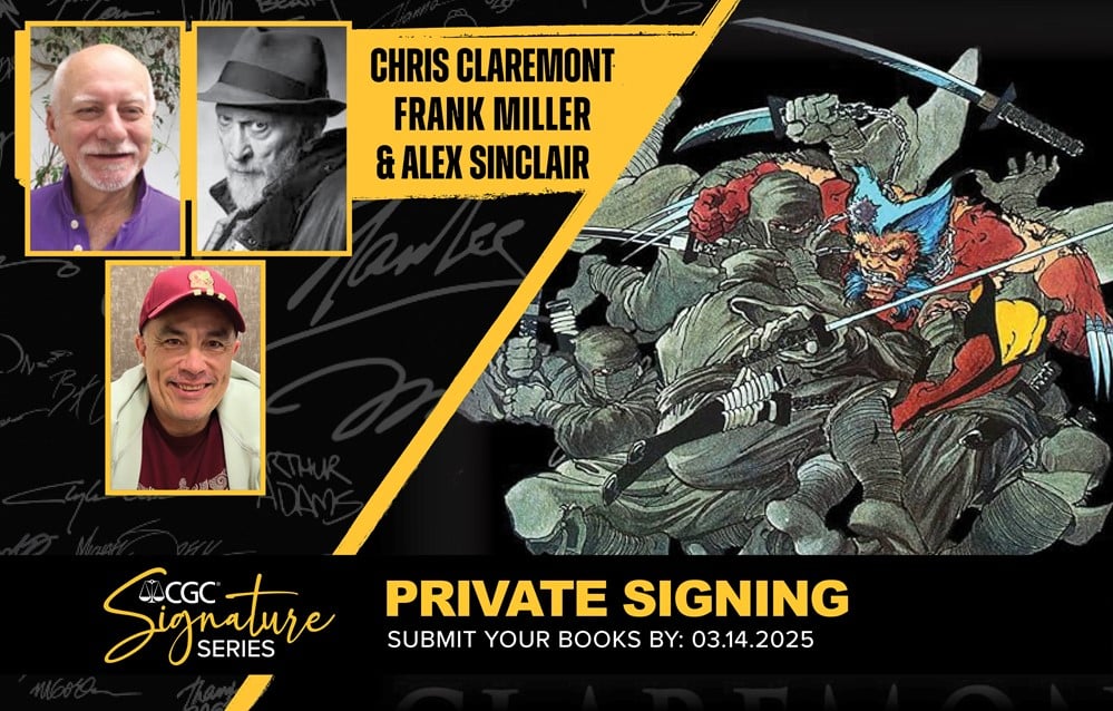CGC is excited to announce that we will be hosting an exclusive Private Signing with influential comic book creators Chris Claremont, Frank Miller and Alex Sinclair! Claremont and Miller are legends in the comic industry for their exemplary work in the medium. Their work on series like Uncanny X-Men and Batman: The Dark Knight Returns set the bar for generations and helped mold the future of the characters in the stories. Sinclair is one of the most well known comic colorists in the business and has worked with Miller on many projects over the course of his career. For this event, Claremont will be offering his signature “SNIKT!” Inscription and Remarque options, and Miller will be offering Remarque and Sketch options as well. See pricing and details below.