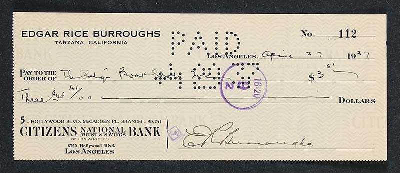 One of the most interesting items is a check signed by Edgar Rice Burroughs that was made out to a bookstore in 1937. It is offered with a JSA letter of authenticity.