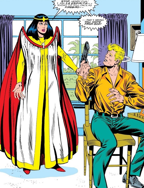 On her own again, Firebird went on a religious retreat and emerged with the new name, La Espirita. She stopped Hank Pym from attempting suicide and helped him reinvent himself and move on from his past. La Espirita, Hank, and Moon Knight saved the Avengers when they were trapped in the past, and helped them against people like Sunstroke and the Collector.