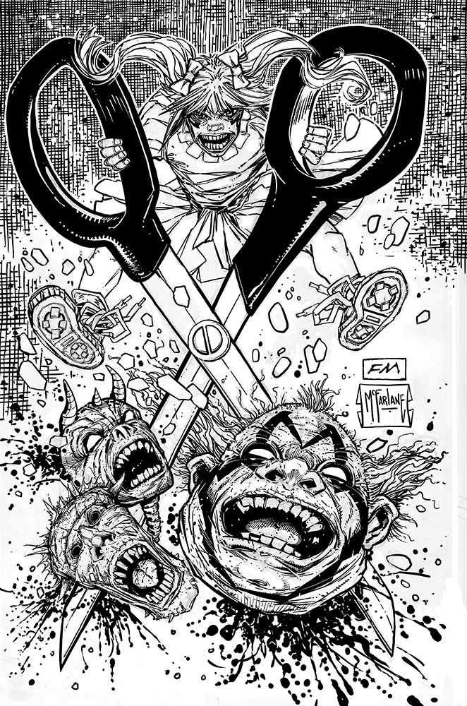 The Curse of Sherlee Johnson #3 variant cover features Miller’s pencils and inks with colors by Alex Sinclair. Miller’s pencils are reinked by McFarlane for a 1:25 incentive black and white variant.
