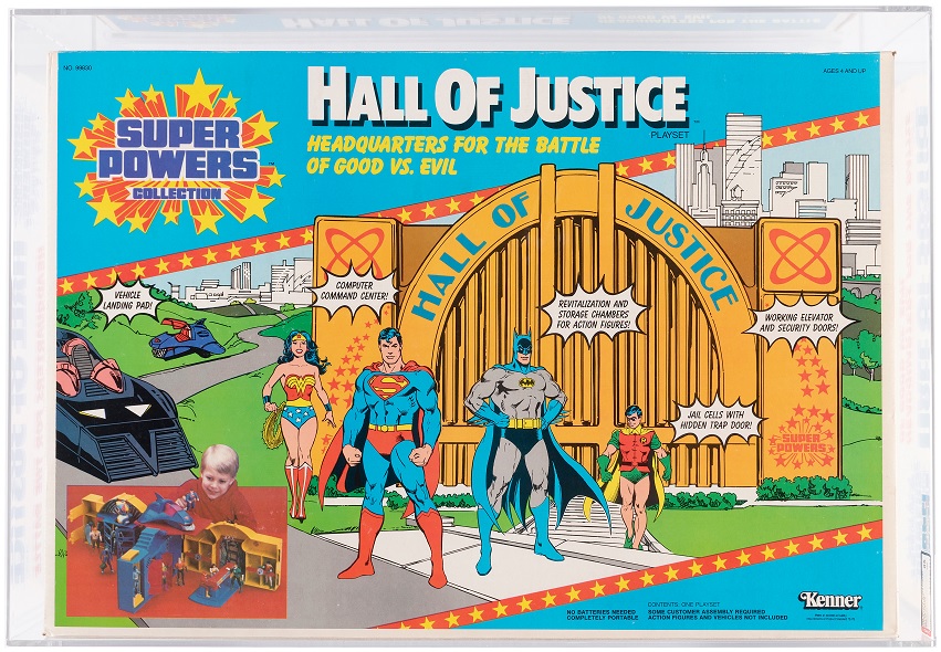 One of the biggest superhero teams flies into the auction with the Super Powers Collection Hall of Justice Series 1 playset AFA 85. Made for DC’s Justice League, the set contains a vehicle landing pad, computer command center, revitalization and storage chambers for action figures, working elevators and security doors, and jail cells with a hidden trap door. It is a high grade example with none graded higher.