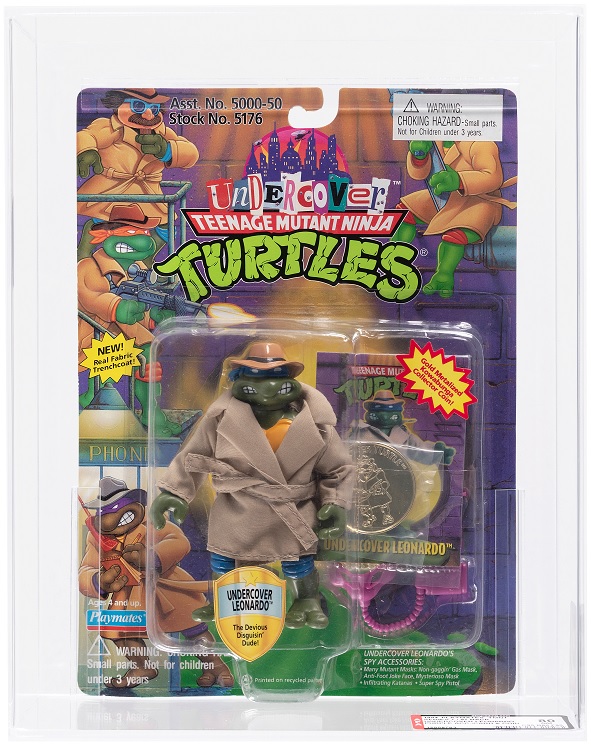 New York’s pizza loving heroes are represented with the Teenage Mutant Ninja Turtles Undercover Series 7 figures on 97-back cards. They include Leonardo AFA 80 with purple accessories and matching collectors card and coin, Donatello AFA 80 with blue accessories and matching collectors card, Raphael AFA 80 with yellow accessories and matching collectors card, and Michaelangelo AFA 75+ with green accessories and matching collectors card.
