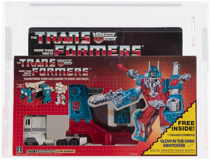 Leading the Robots in Disguise is the Transformers Series 3 Ultra Magnus AFA 80 unpainted face version that advertises the glow in the dark mini poster. It is among the most desirable Series 3 Transformers toys and the first Hake’s has offered of this variety. The rare piece is one of only two examples that have been graded by AFA.