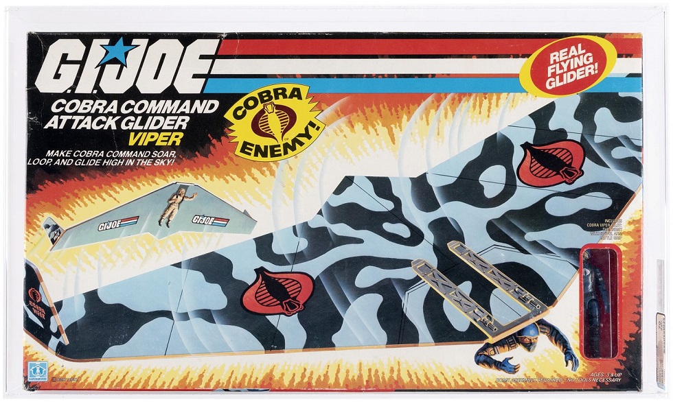 The G.I. Joe Viper Cobra Command Attack Glider Series 2 vehicle AFA 70 is from the first release, it’s the no barcode variety, and is on a peach file card. This is one of only two gliders made for the G.I. Joe toy line.