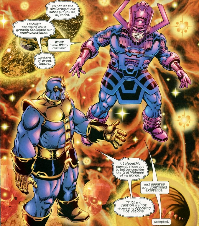 When Galactus finally ended Silver Surfer’s exile on Earth, he was attacked by the Elders of the Universe. Surfer and Nova helped Galactus to defeat their advances, including fights with Ego and the In-Betweeners. His next challenge came at the hands of Thanos and the Infinity Gems. Thanos destroyed a planet that Galactus was going to consume, so the latter joined other cosmic beings to help stop the Mad Titan.