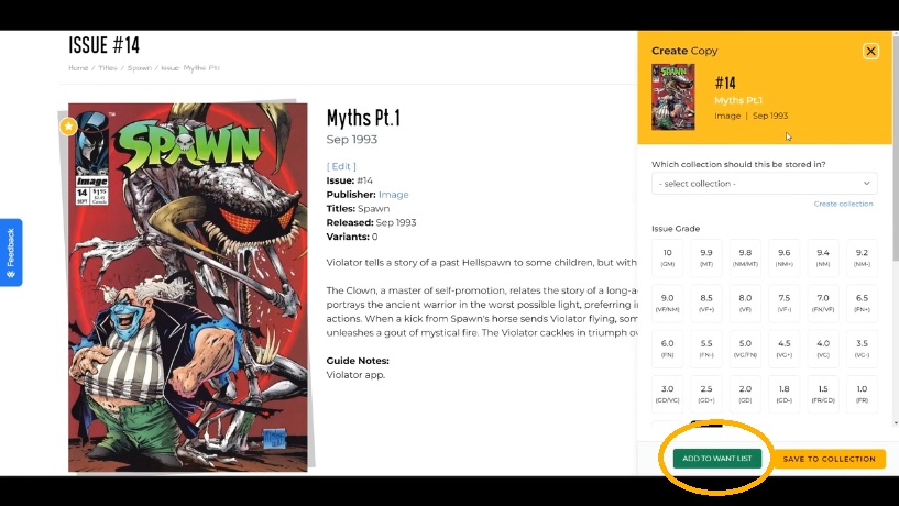 Comics can be added to the want list by clicking on the plus sign in the upper right corner of a comic listing, then selecting “Add to want list” from the side window that appears. A heart icon will then appear on the book cover to show that it’s on your want list, and you can access your want list from the left side menu on your account page.
