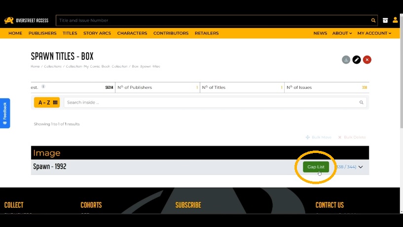 The gap list can be found by clicking on the designated button within a title in your collection. From there, you can add those issues to your want list by clicking on the plus sign icon. The gap list feature can also be used in conjunction with the retailers list to fill holes in your collection.