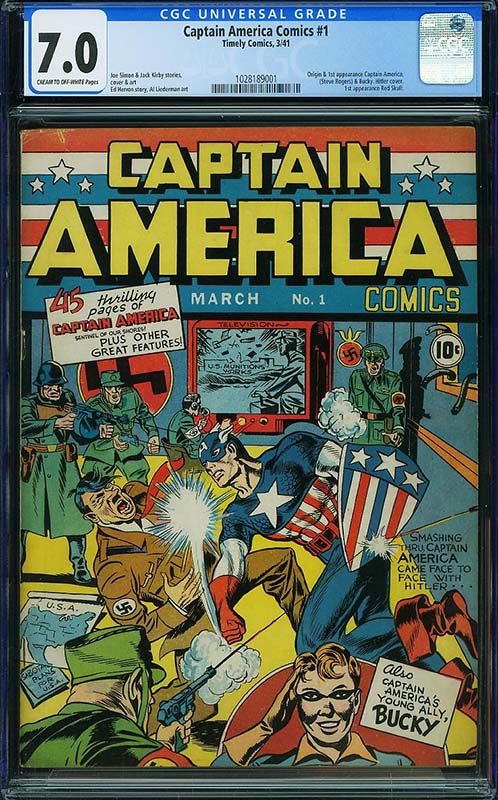 The run begins with Captain America Comics #1 CGC 7.0, featuring the first appearance and origin story showing how frail Steve Rogers was given the Super Soldier formula to become America’s one man army. The first issue also contains the first appearances of Bucky Barnes and the Red Skull.