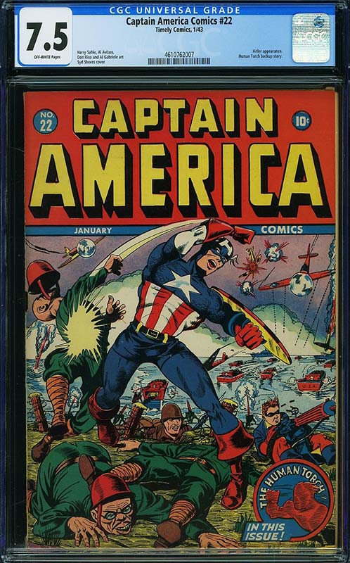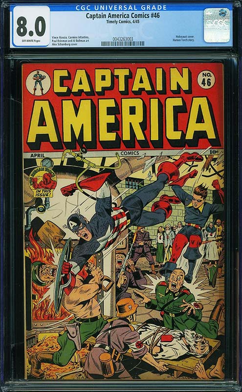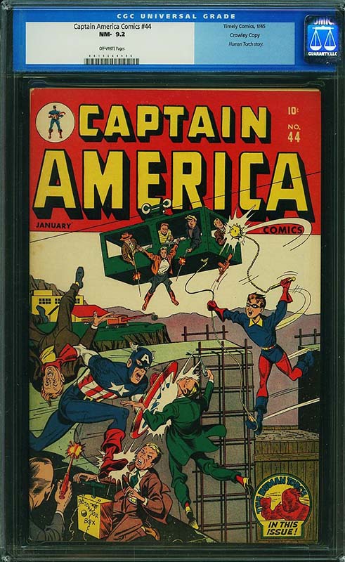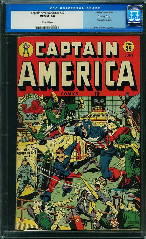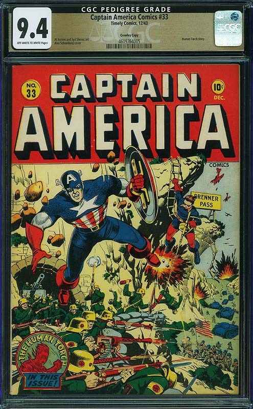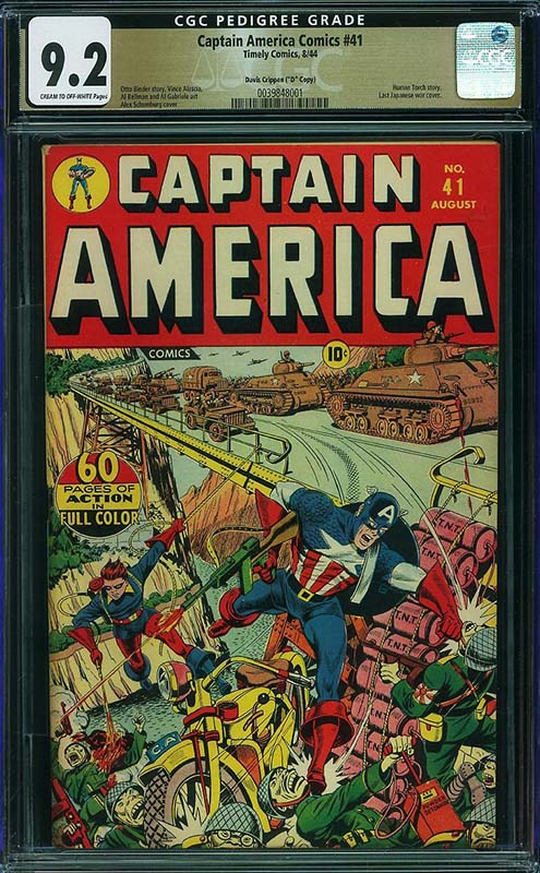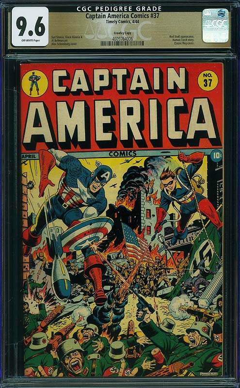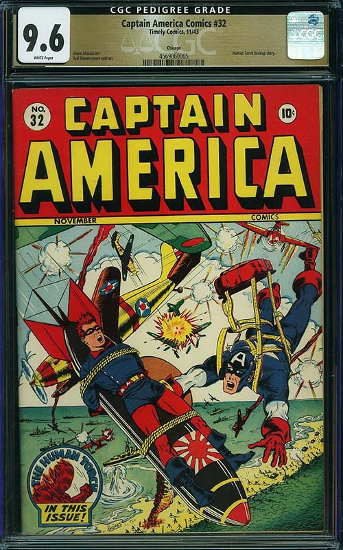 There are many other highlights in the run, including some single highest graded examples such as Captain America Comics #37 CGC 9.6 from the Crowley Pedigree and Captain America Comics #32 CGC 9.6 from the Chicago Pedigree collection. Both feature well known Alex Schomburg World War II covers.