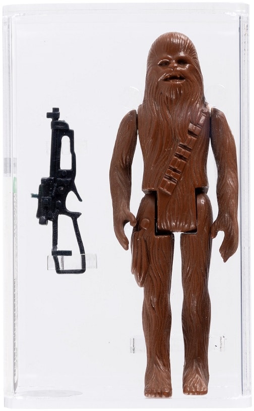 The rarity continues with a Chewbacca first shot action figure AFA 85, which is the earliest complete pre-production Chewbacca figure known to exist. The “First 12” first shots are earlier material and no proto-molds and hardcopies are known to exist with the exception of a few parts. Because this is an earlier version, the details are more pronounced and sharper, and it is made of stiffer plastic than production figures. This First Shot represents one of the earliest Chewbacca figures, as originally sourced from a former Kenner employee who stated it was among the first created upon completion of the molds.