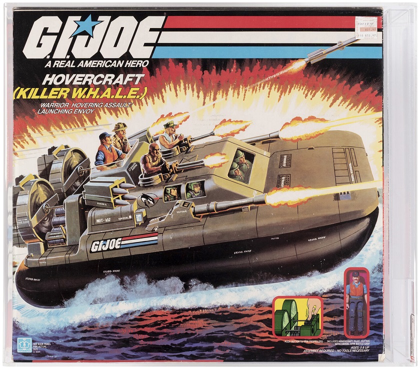 The large, impressive G.I. Joe Hovercraft (Killer W.H.A.L.E.) Series 3 vehicle AFA 85 is leading the charge. Featured in both the G.I. Joe cartoon and comics, the Killer W.H.A.L.E. Hovercraft is one of the most coveted G.I. Joe vehicles. At the time of cataloging, only ten sealed examples have been graded by AFA with only one graded above AFA 85. This is the first time Hake’s has offered the piece in this high grade condition.