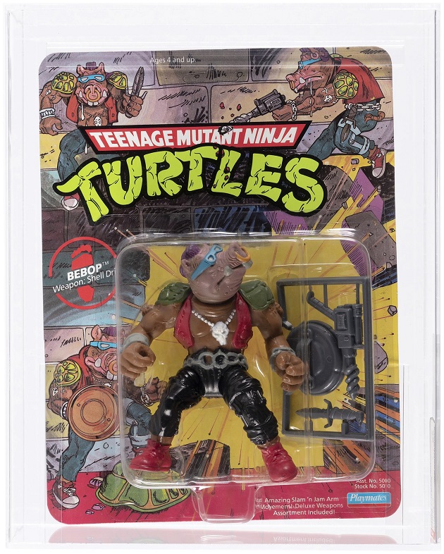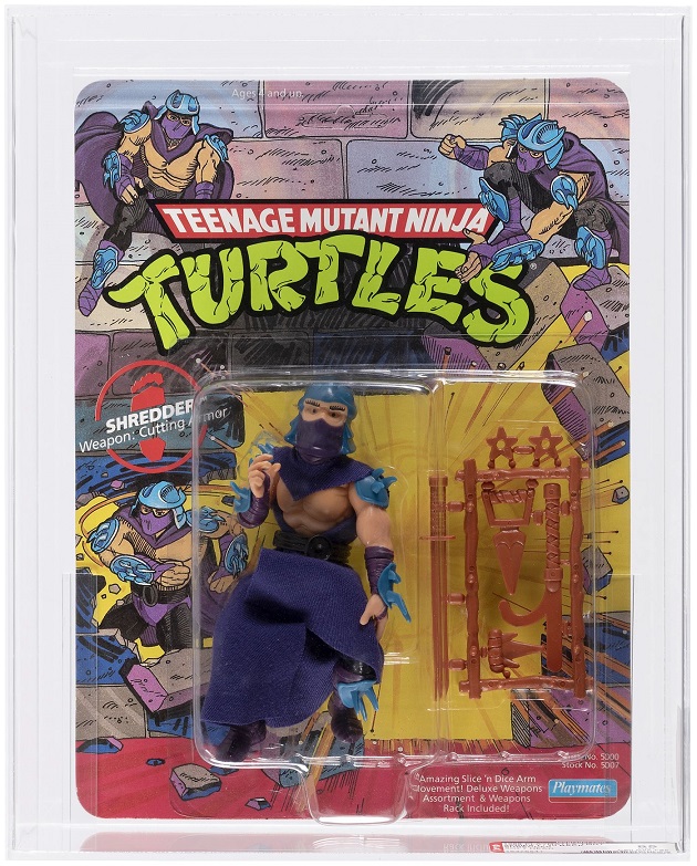 In the Teenage Mutant Ninja Turtles section, Hake’s is offering a Shredder Series 1 10-back AFA 85. This is the soft head variety, and the figure is on an unpunched card. There are only 11 graded AFA 85 and none are graded higher.