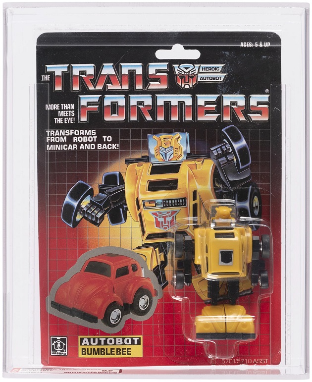 The Transformers lots roll out with a Bumblebee Series 2 Minicar (robot form, yellow variety) AFA 85. In an effort to make the early Transformers toy line appear larger, both Bumblebee and Cliffjumper (as both shared distinct similarities) were released in yellow and red color varieties. This is the fourth release with the Registered mark and shows the red vehicle on the card. There are only nine examples graded AFA 85 on the AFA Population Report with none higher.