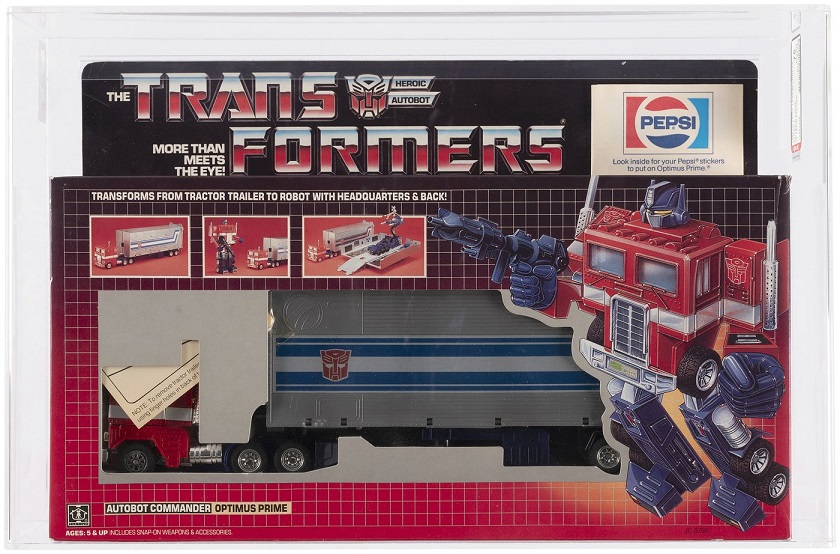 The Optimus Prime Series 1 AFA 75 is the rare Pepsi variant, which was issued as a limited edition mail-away offer by the soda company. This Generation 1, Series 1 Optimus Prime is the standard US release but comes with the Pepsi logo on the header and “Look Inside For Your Pepsi Stickers To Put On Optimus Prime” text. A rare piece, it is among the most desirable Series 1 Transformers toys.