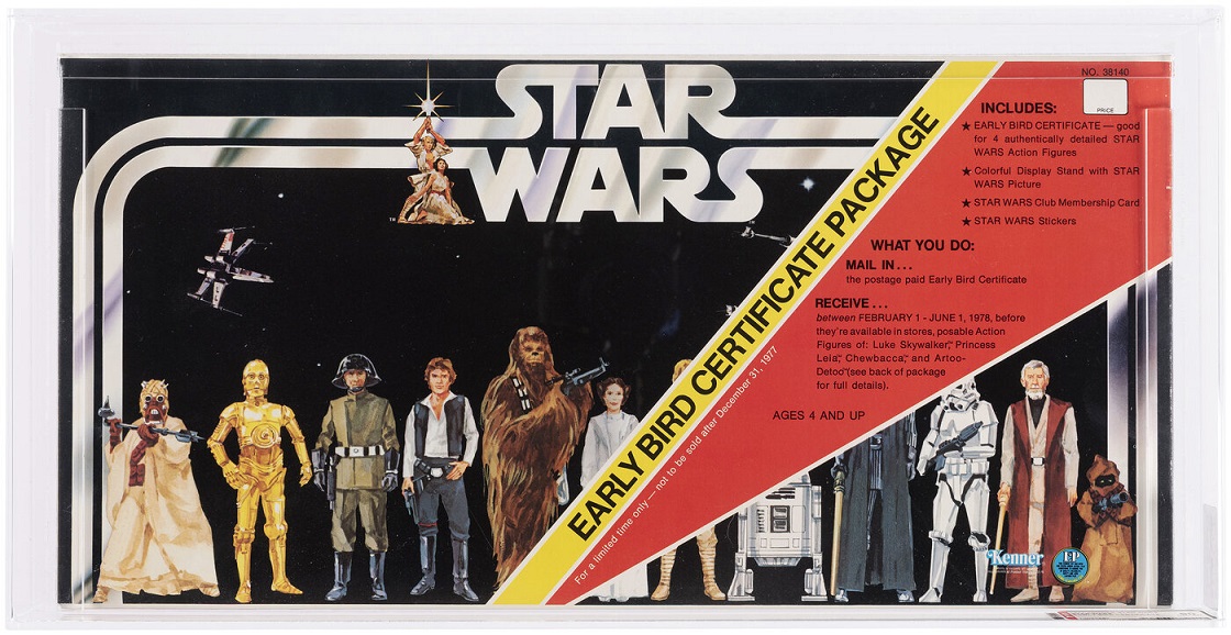 Hake’s is offering a trio of important items connected to the Star Wars Early Bird program. Kenner received massive interest in Star Wars toys and the company had a short amount of time to design, test, produce, and package the figures. Because they weren’t able to build stock before the holiday season of 1977, they sold an “Early Bird Certificate Package.” It included a display stand and certificate that the purchaser could use to redeem for the first round of Star Wars figures once they were available.