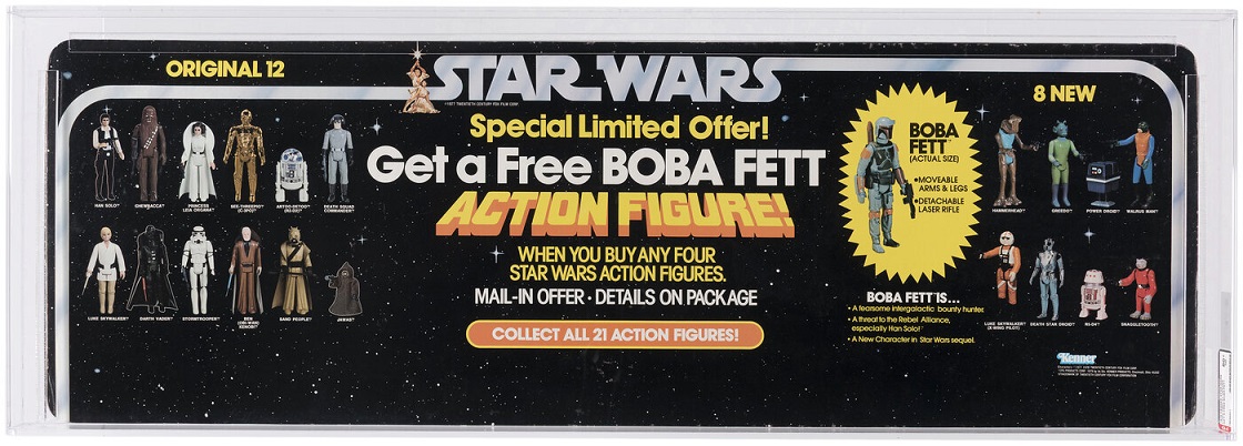 The display lots continue with a very rare “Get a Free Boba Fett” long display header AFA 80+. The double-sided 12” x 36” long cardboard header display has the Star Wars logo at the top center with classic images of Luke Skywalker and Princess Leia. The left side shows photos of the original 12 Star Wars figures and the right shows the eight new figures with a large image advertising the Boba Fett figure offer. Only four examples have been graded by AFA and this is the first time one has been offered at auction.