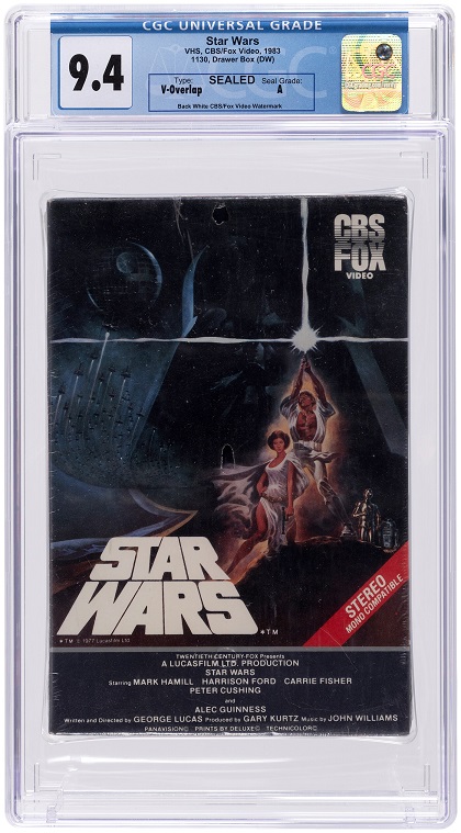 Outside of the toy section, Hake’s is offering a copy of the Star Wars VHS CGC 9.4 that was released by CBS/Fox Video in 1983. This is a sealed drawer box copy with V-overlap and white CBS/Fox Video watermark. It is one of less than five sealed copies known to exist.